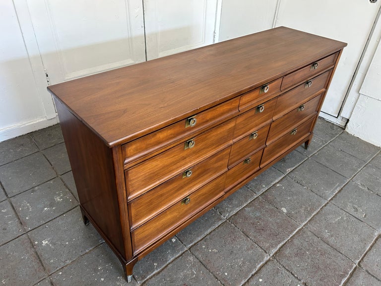 Mid Century Modern 12 Drawer Walnut Dresser Credenza Ring Brass Pull Handles For Sale At 1stdibs